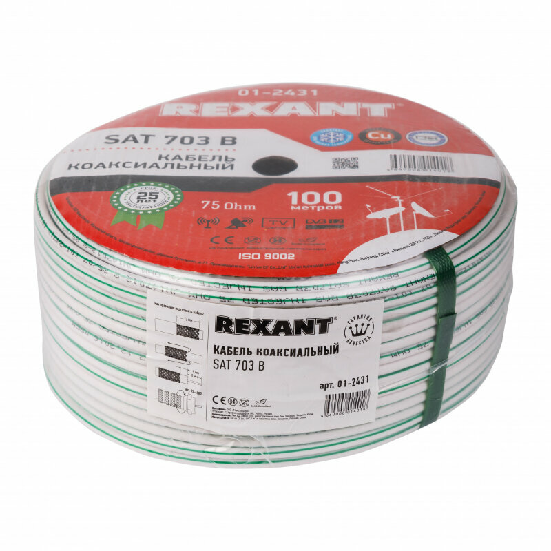 Rexant (01-2431) SAT 703B Cu/cu 75 Ом, 100м, белый 75 Ом,оплетка CU медь, экран AL фольга, жила CU .