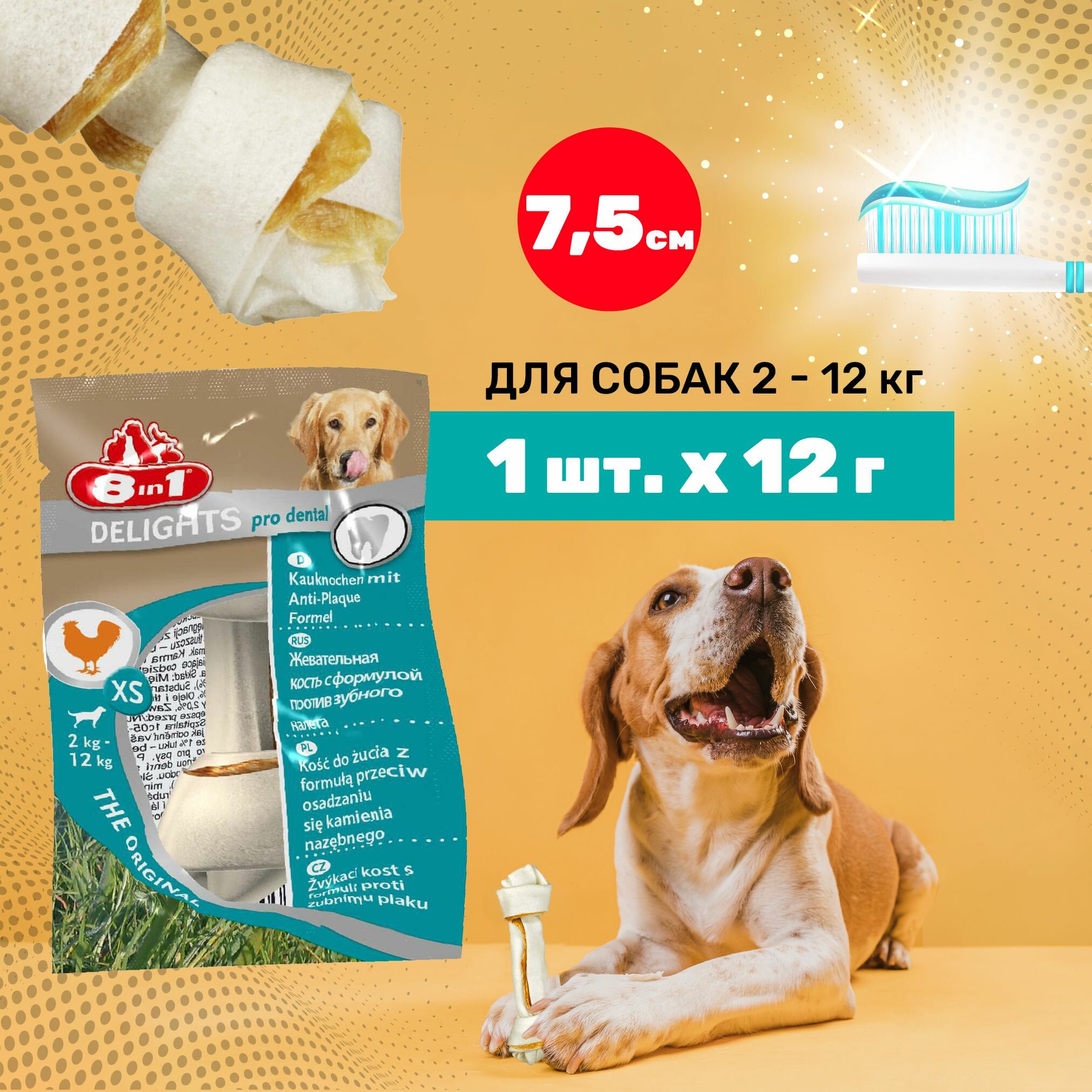 8in1 Лакомство для собак Delights Pro Dental Косточки XS / 7.5 см / 7 шт. х 12 г