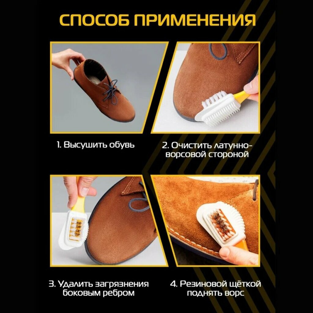 Легко удаляет загрязнения, с помощью бокового ребра можно легко очистить швы, имеется резиновая поверхность Недостатки: Недостатков не нашёл на данный момент Идеально подходит для обуви из замши и нубука |