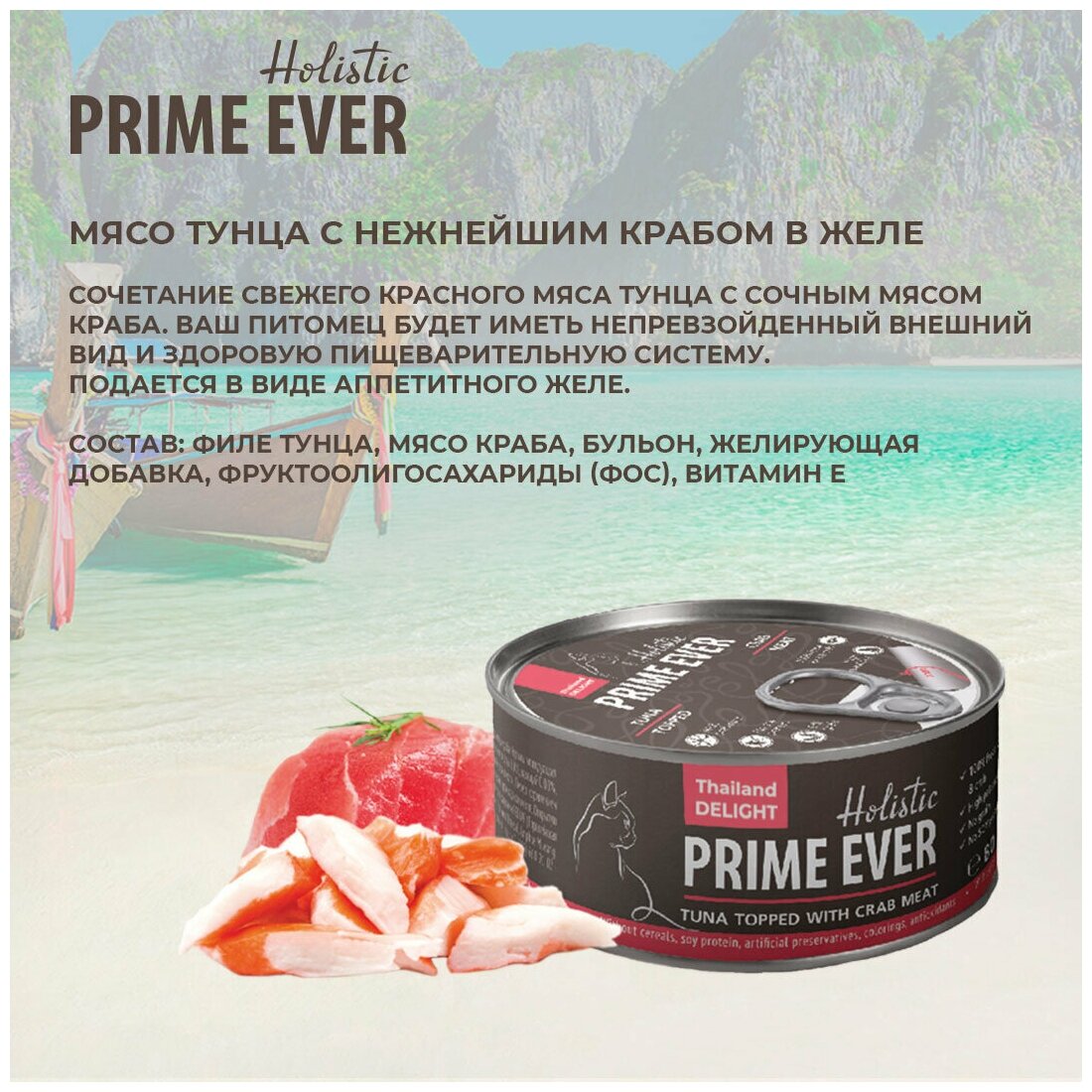 Влажный корм для кошек, тунец с крабом в желе, холистик, Prime Ever, упаковка 12 шт х 80 г