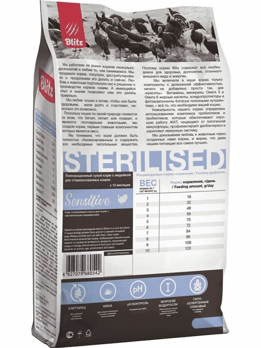 Blitz Sensitive Sterilised Cats полнорационный сухой корм для стерилизованных кошек, с индейкой