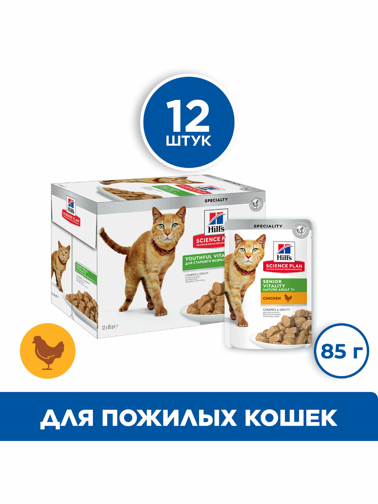 Влажный корм Hill's Science Plan Senior Vitality для пожилых кошек (7+)для поддержания активности и жизненной энергии, пауч с курицей, 12 шт. х 85 г