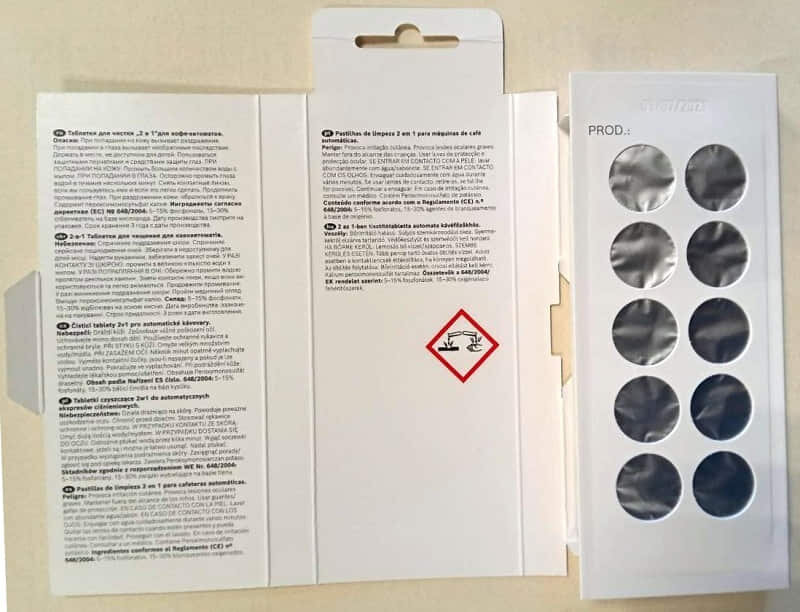 | Отзыв: | Упаковка = 10 таблеток. Каждая чистка = 2 таблетки. При активном потреблении кофе требуется упаковка в год. Я бы ждал на рынке упаковочку с таблетками для очистки большего размера. |