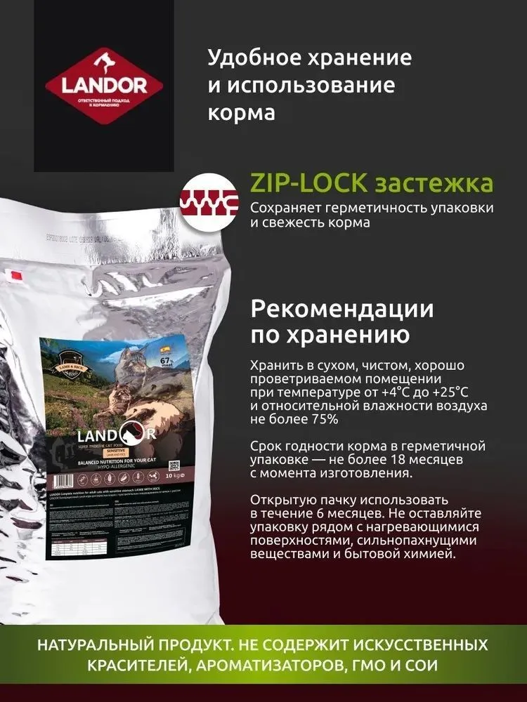Сухой корм LANDOR для взрослых кошек для взрос кошек с чувствительным пищеварением, полнорационный, с ягненком и рисом 10 кг