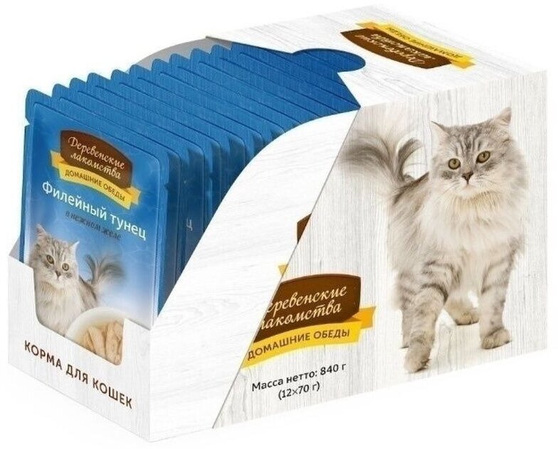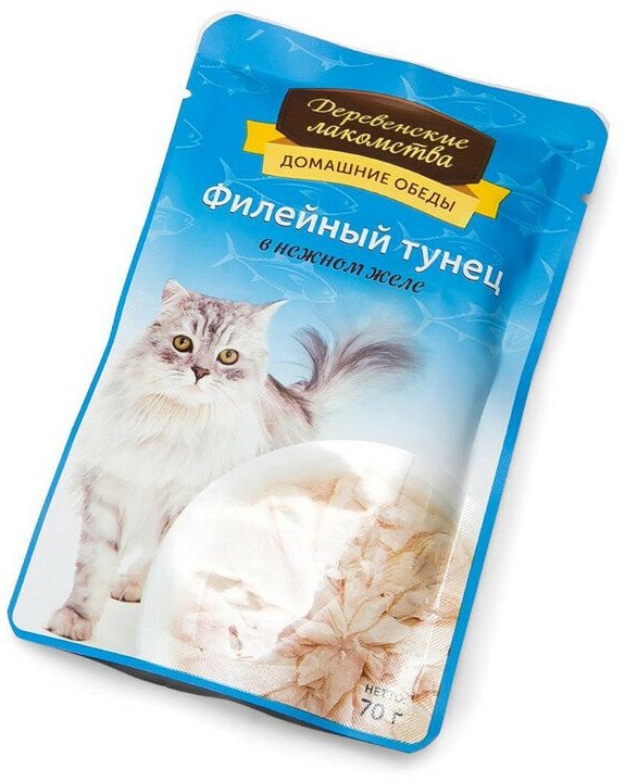 Корм для кошек деревенские лакомства Филейный тунец в нежном желе пауч 70г (упаковка - 12 шт)