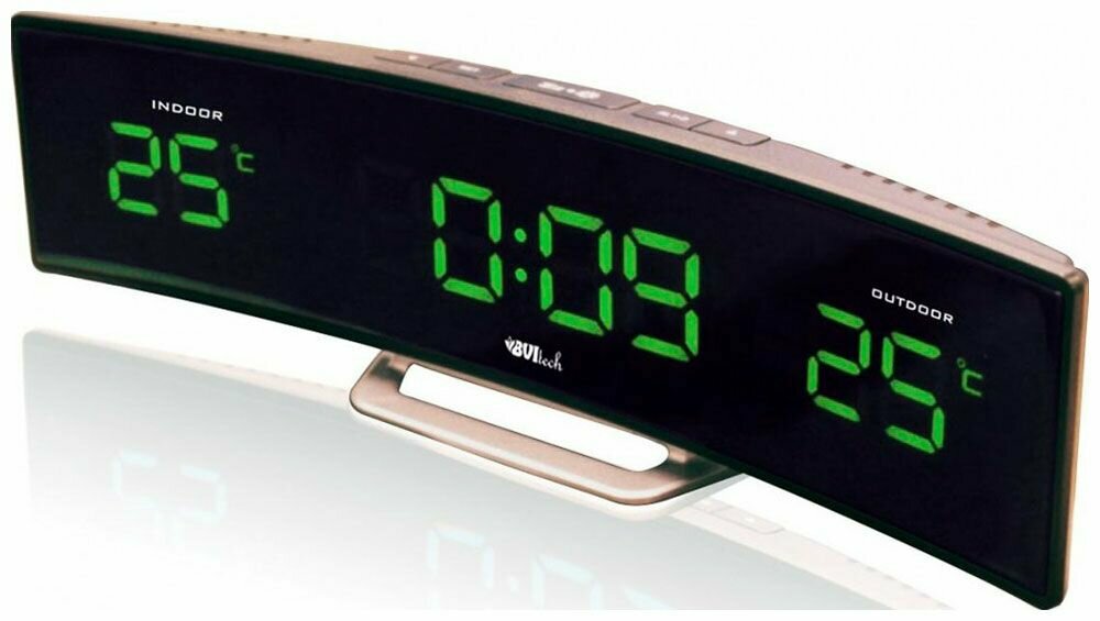 | Плюсы: | Мне понравился дизайн и качество сборки - есть металлические детали. Изогнутая форма вписалась под телевизор! Цифры большие и яркие! Пока прибор показывает точное время, погоду иногда за бортом завышает ... |