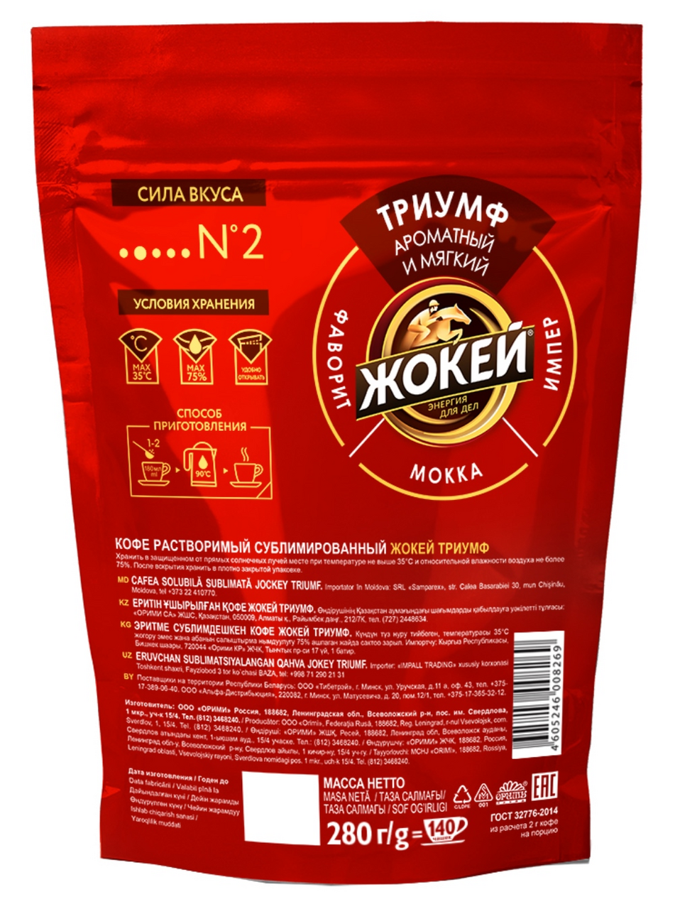 Жокей Триумф Кофе растворимый сублимированный арабика в мягкой упаковке 280 г