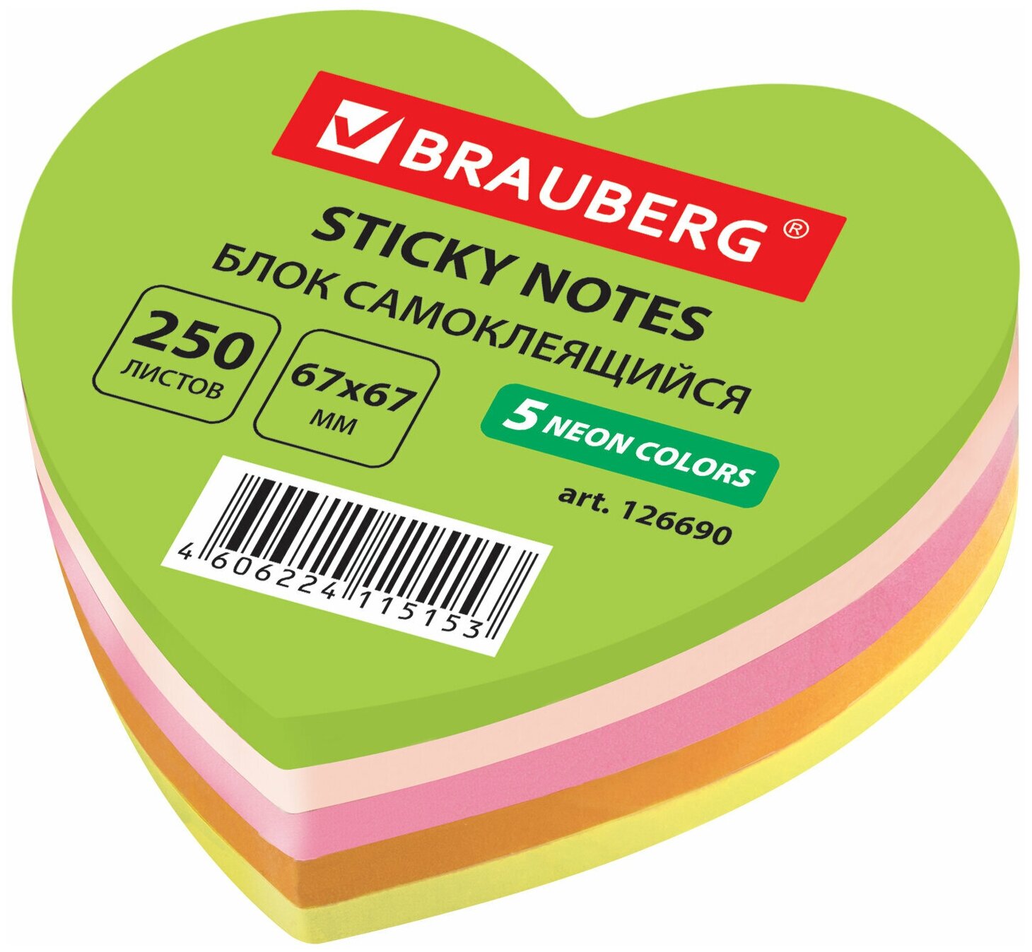 Блок самоклеящийся (стикер) Brauberg фигурный, неоновый, в форме сердца, 67х67 мм, 250 листов, 5 цветов (126690)