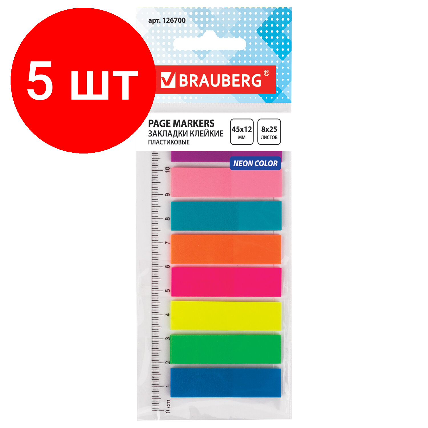 Комплект 5 шт, Закладки клейкие BRAUBERG неоновые пластиковые, 45х12 мм, 8 цветов х 25 листов, на пластиковой линейке 12 см, 126700