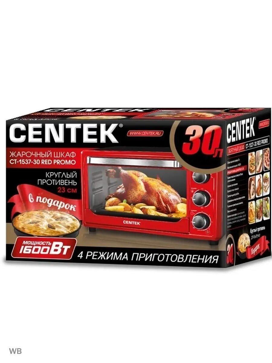 Жарочный шкаф CENTEK CT-1537-30 RED красный 30л 1600Вт +противень, таймер 90мин, 4 реж., max 320°