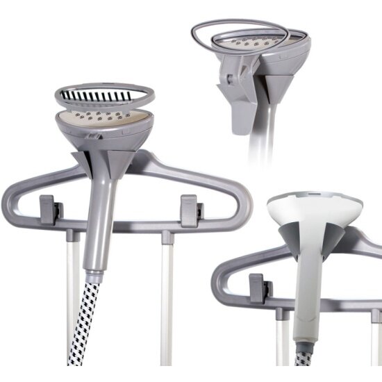 Немного не удобно вешать вещь на стойку, т.к. утюжок тоже крепится на стойке и получается, накрываешь вещью сам утюжок. И приходится его вынимать из-под одежды. Вещи отпаривает хорошо, быстро, но они становятся влажными. Немного плюется водой, но только в нижнем положении. Если шланг полностью выпремлен, такого эффекта нет. Нет, колесиков, но можно поднимать за вешалку, вполне удобно, не тяжело переносить. |