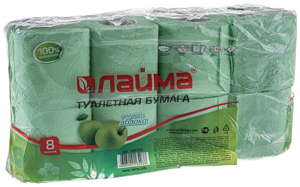 Купить Бумага туалетная бытовая, спайка 8 шт., 2-х слойная, (8х19 м), LAIMA/лайма, аромат яблока, 128723 (цена за 1 ед.товара)
