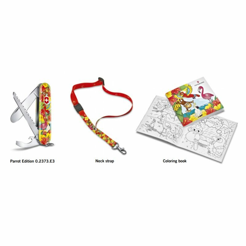 СохранитьНабор для детей VICTORINOX "Попугай": перочинный нож 84 мм, шнурок на шею, книга-раскраска, красный интересное: