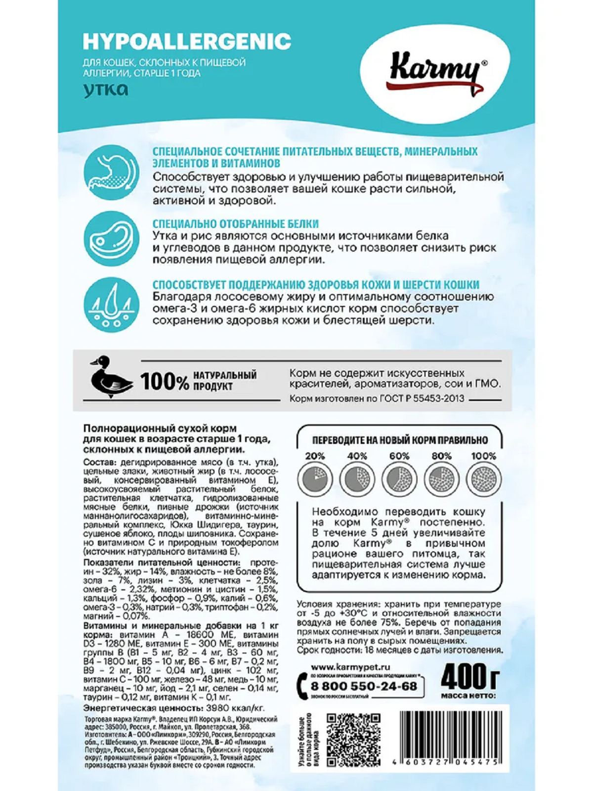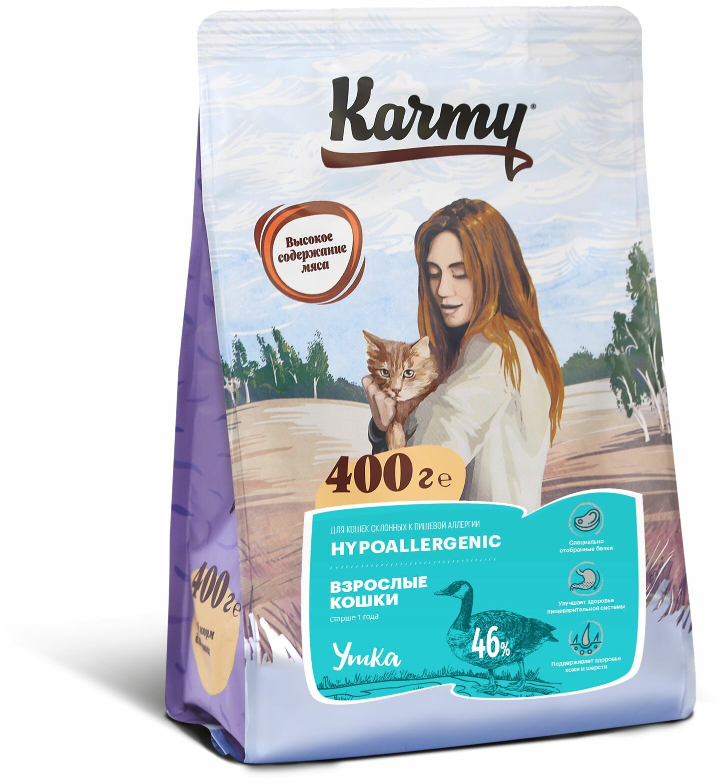 Karmy Hypoallergenic Утка корм для аллергичных кошек от 1 года, 0,4 кг