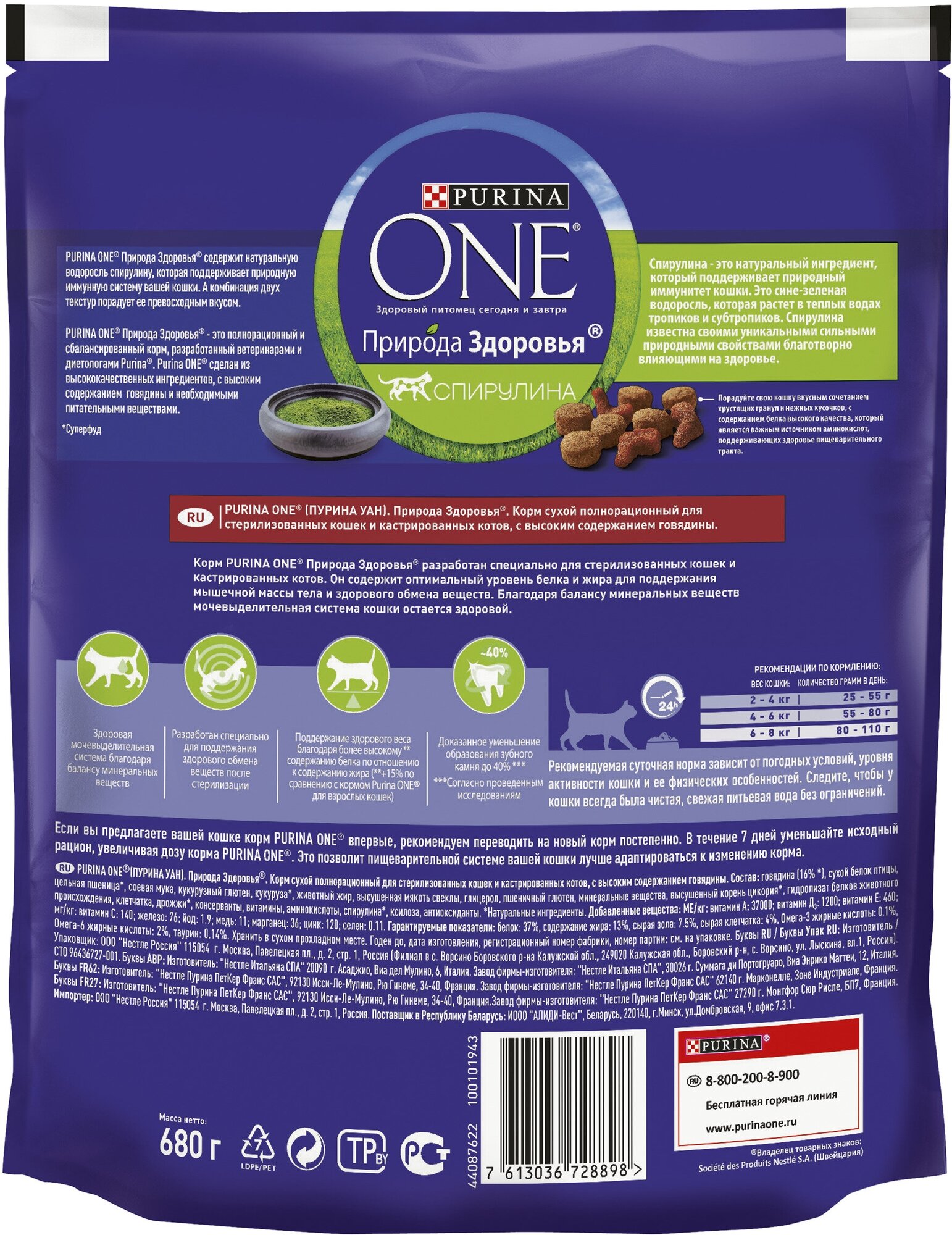 PURINA ONE природа здоровья для взрослых кастрированных котов и стерилизованных кошек с говядиной (0,68 кг)