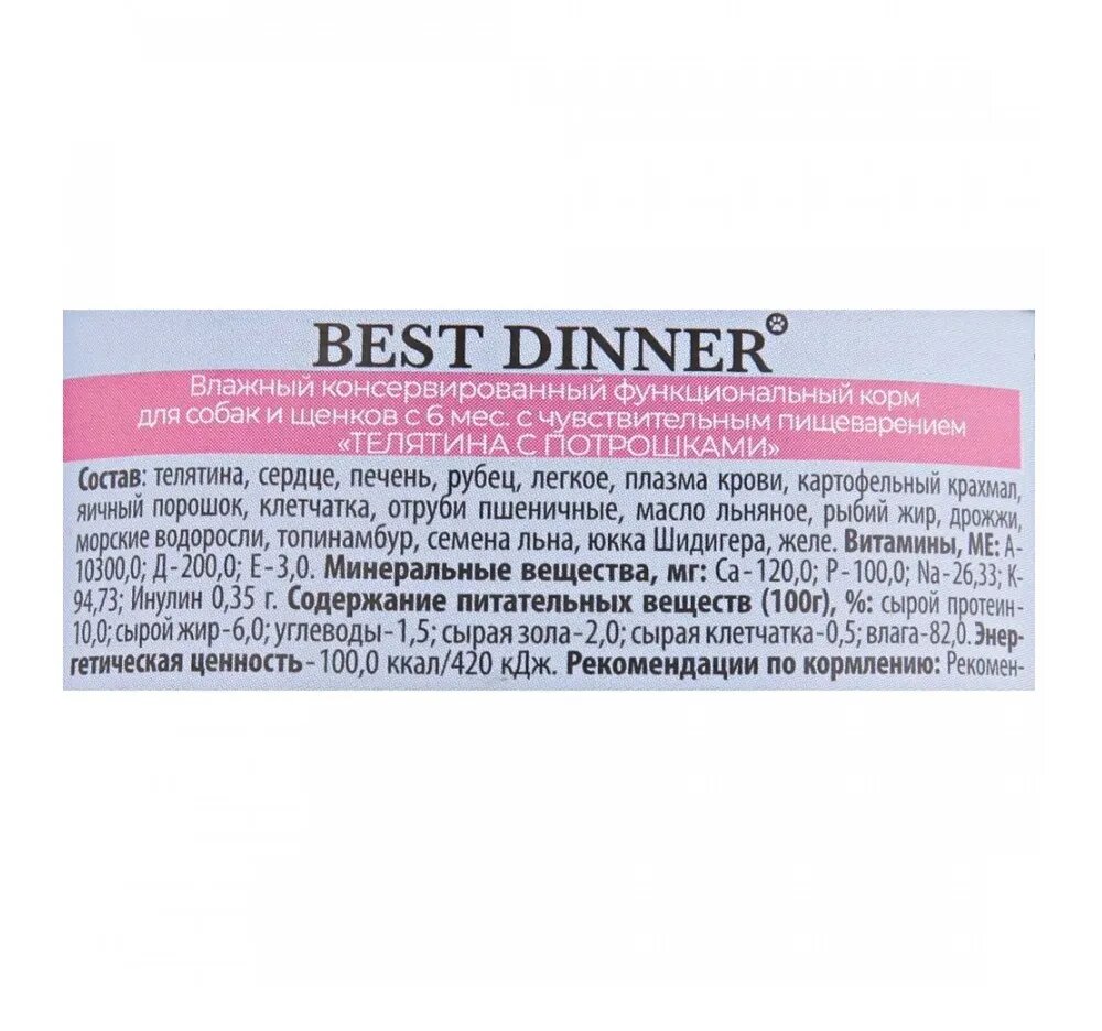 BEST DINNER EXCLUSIVE GASTRO INTESTINAL для собак и щенков с чувствительным пищеварением с телятиной и потрошками (100 гр х 24 шт)