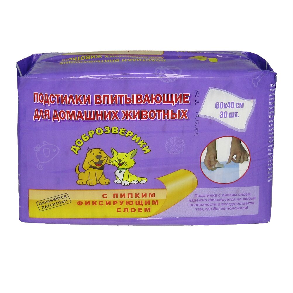 Доброзверики подстилки для животных с липким фиксирующим слоем, 60х40 см, 30 шт