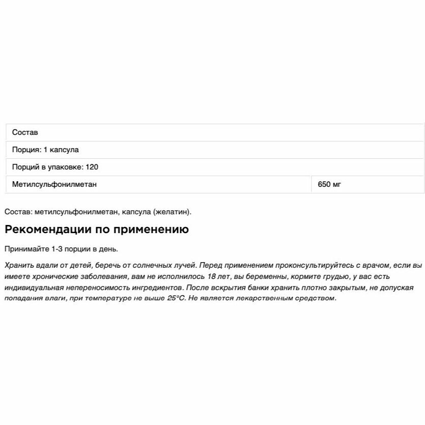 | Отзыв: | MSM проверенный препарат для поддержания суставов . Быстро помогает мне устранить боль и воспаление .