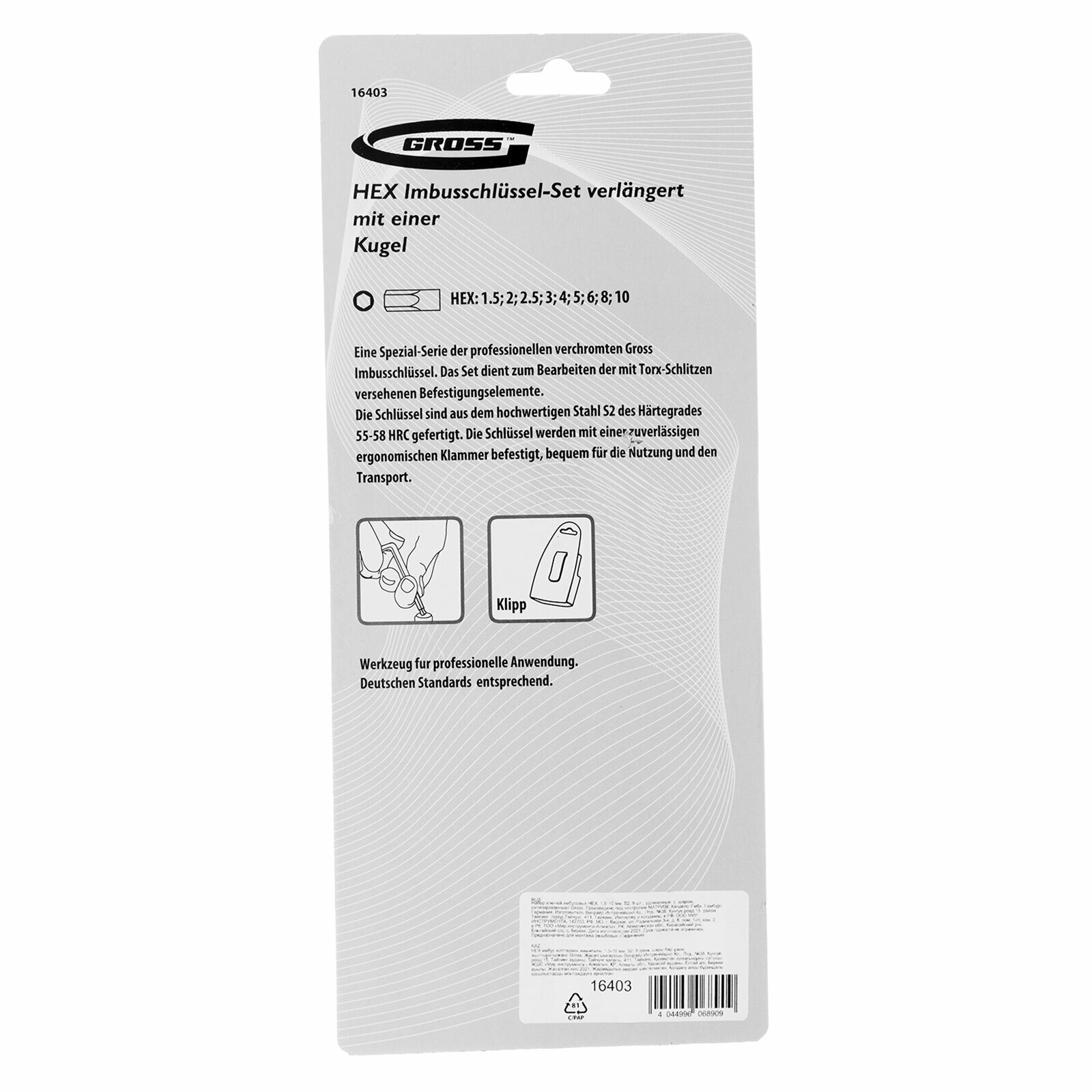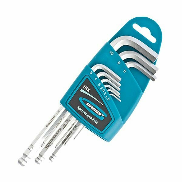 Набор ключей имбусовых HEX, 1,5–10 мм, S2, 9 штук, удлиненные с шаром, сатинированные Gross