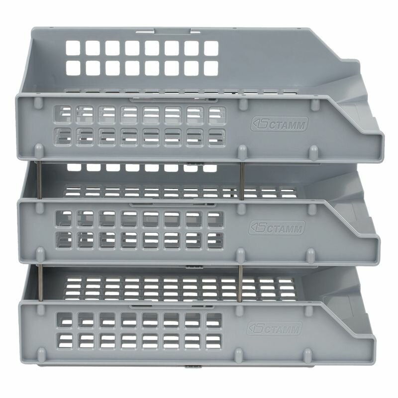 Лоток для бумаг горизонтальный СТАММ набор 3 шт. (340х260х240 мм), на металлических стержнях, серые, СТАММ "Strong", ЛТ111