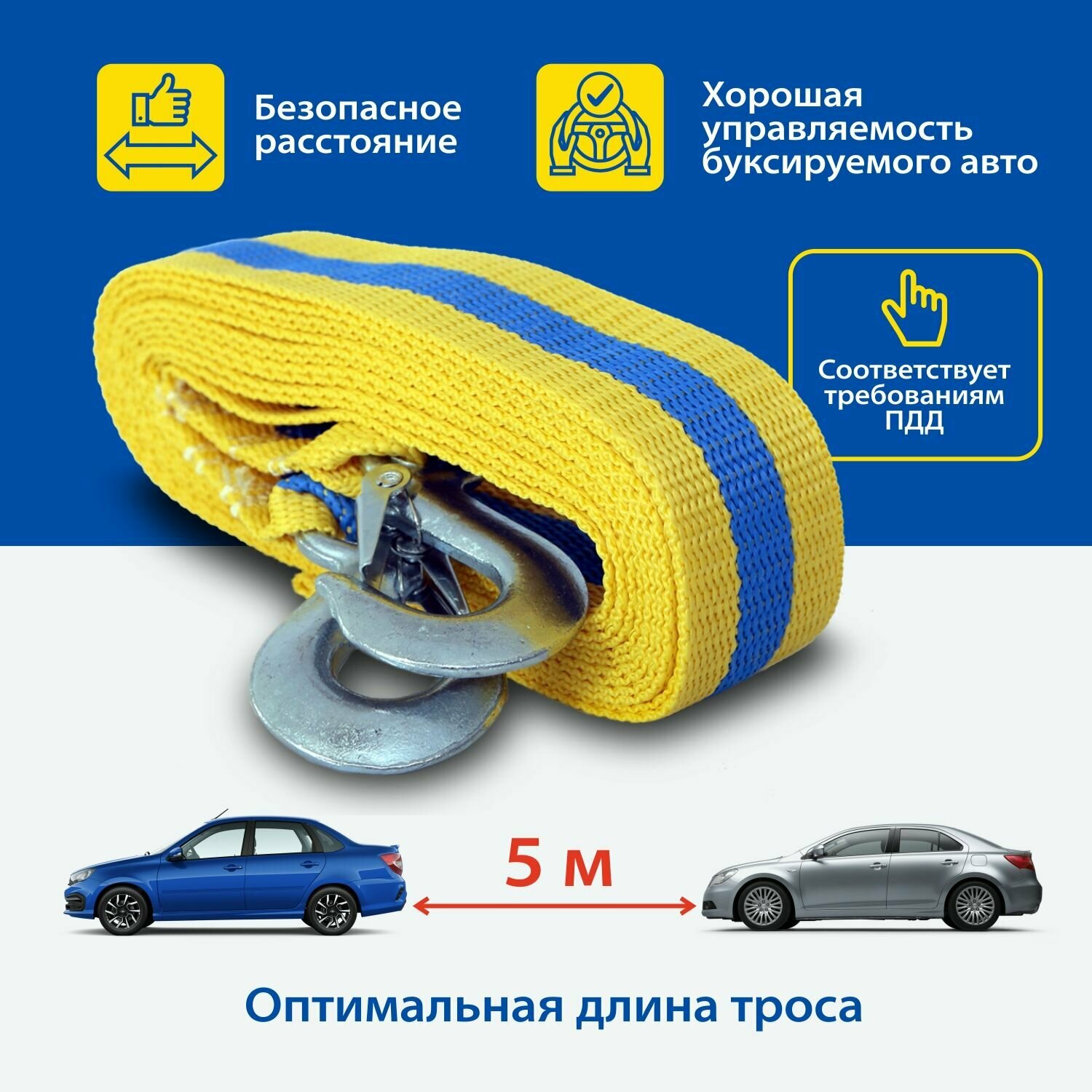 Трос Буксировочный До 5 Тонн, 5 Метров, Сверхпрочная Полипропиленовая Нить, Сумка, 2 Крюка, Устойчив К Воздействию Влаги И Не...