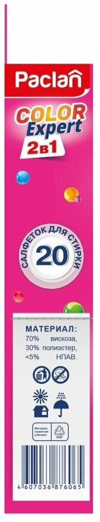 Салфетки для стирки PACLAN Color Expert, 2 в 1, пятновыводитель, 20 штук (410143/4101437/410153)