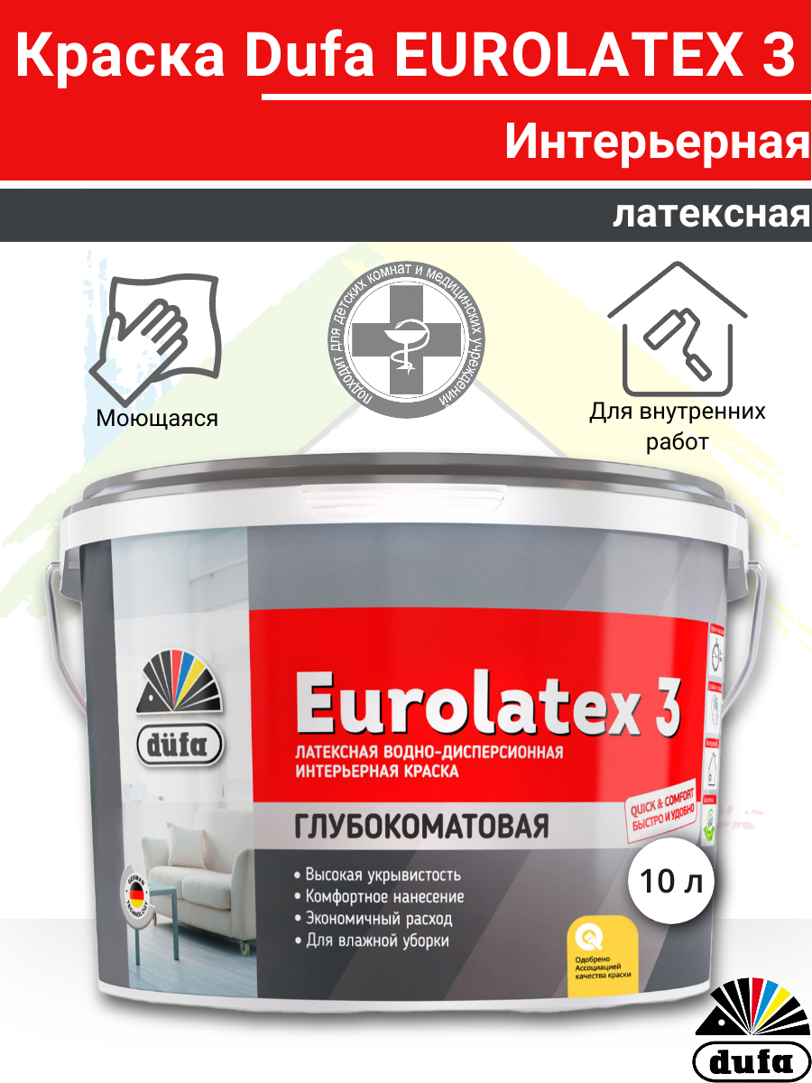 Ниже Вы можете прочитать отзывы на Краска DUFA Retail Eurolatex 3 латексная глубокоматовая 10 л, ознакомится с подробными характеристиками, посмотреть интересные обзоры и фотографии на Краска DUFA Retail Eurolatex 3 латексная глубокоматовая 10 л.