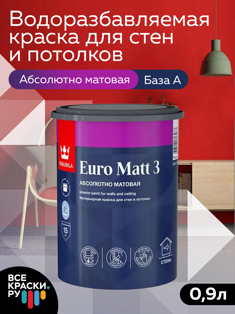 Купить Краска Tikkurila Euro Matt 3 для стен и потолков, глубокоматовая латексная, база A, 0.9л