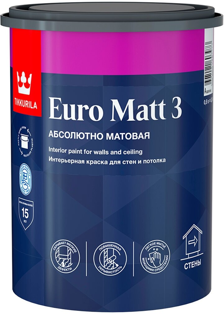 Tikkurila Euro Matt 3 Краска интерьерная для стен и потолков (белый, глубокоматовый, база A, 0,9 л)