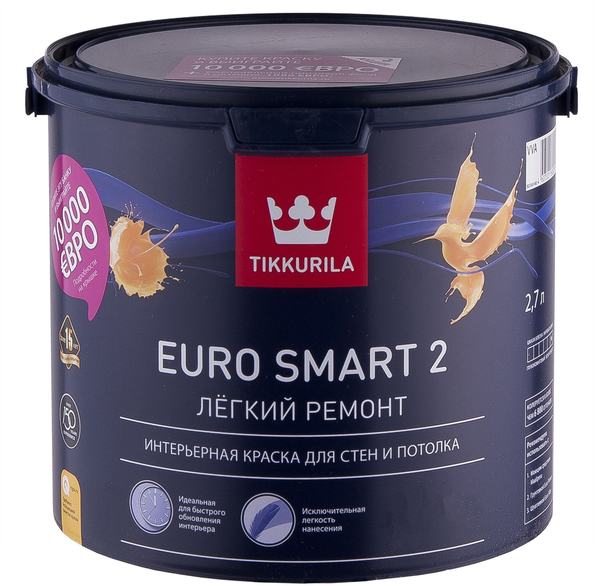 Купить Краска акриловая Tikkurila интерьерная Euro Smart 2 моющаяся глубокоматовая белый 2.7 л