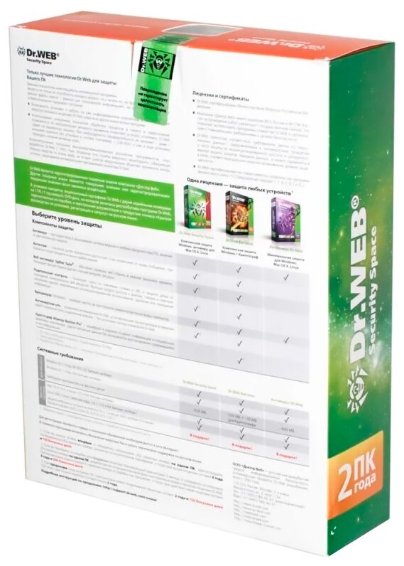 Ниже Вы можете прочитать отзывы на Dr.Web Security Space, коробочная версия с диском, русский, количество пользователей/устройств: 2 ус., 24 мес., ознакомится с подробными характеристиками, посмотреть интересные обзоры и фотографии на Dr.Web Security Space, коробочная версия с диском, русский, количество пользователей/устройств: 2 ус., 24 мес..