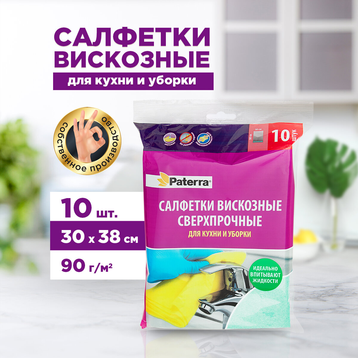 Салфетки вискозные «сверхпрочные» для кухни и уборки, PATERRA, 10 шт. в упаковке, 30 х 38 см