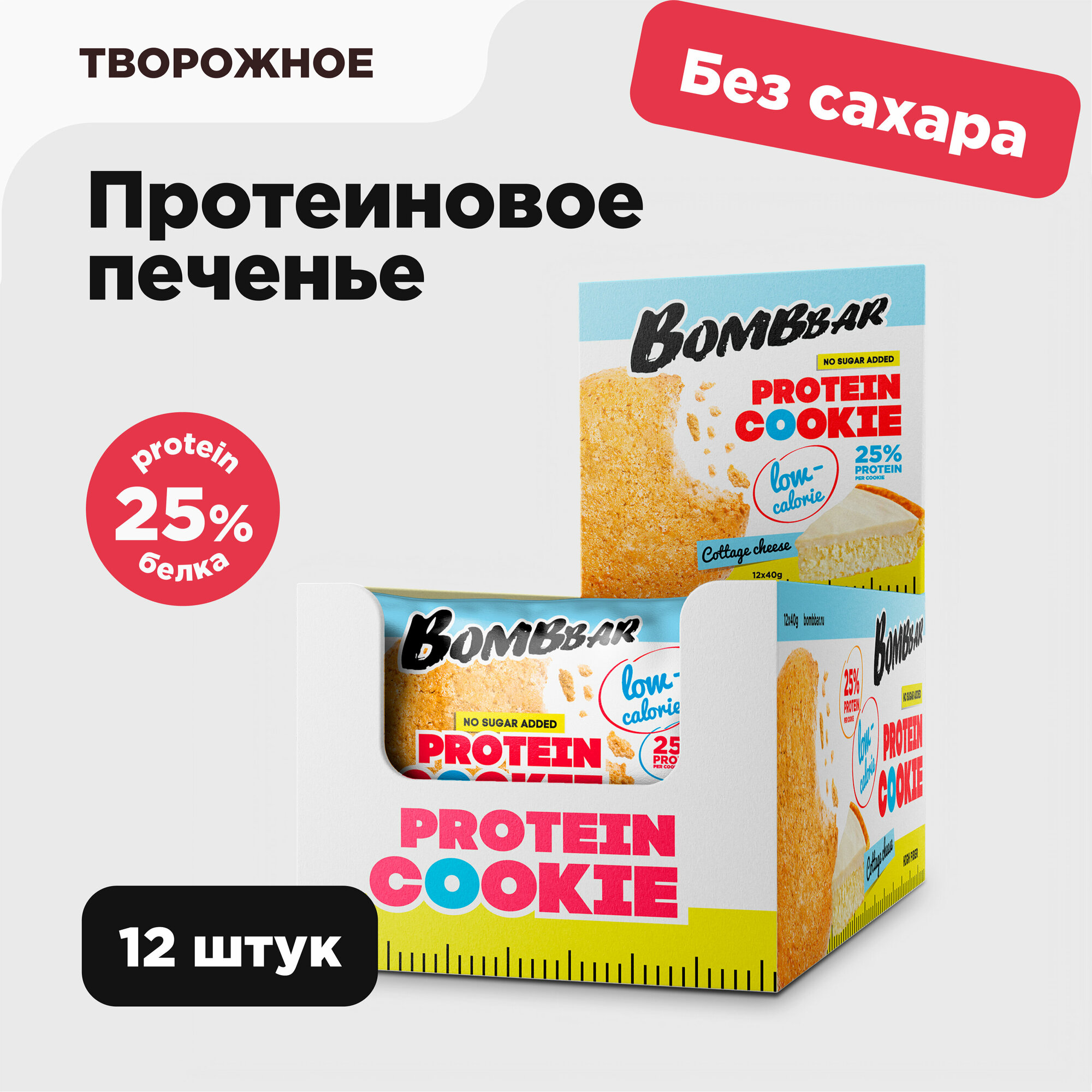Протеиновое печенье низкокалорийное Bombbar Protein Cookie без сахара, Творог (12шт по 40г)