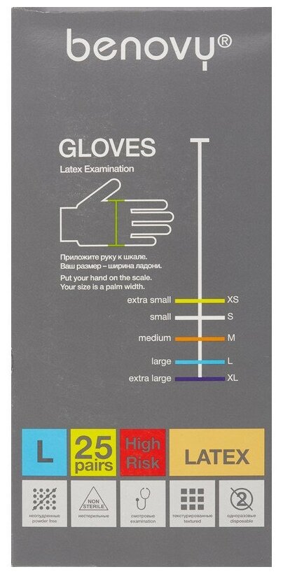 Benovy Перчатки Benovy (L) латексные нестерильные текстурированные, 50 пар/уп