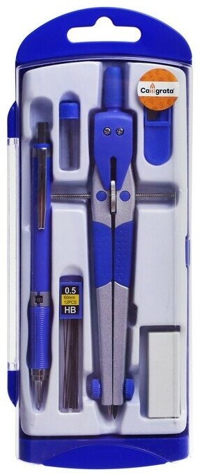 Calligrata Готовальня, 6 предметов (циркуль, точилка, грифель, ластик, карандаш механический 0,5 мм, грифель НВ 0,5 мм) в пластиковом пенале