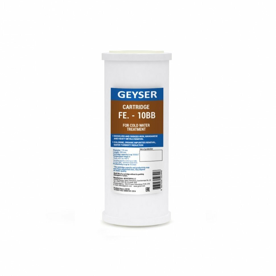 Картридж обезжелезивание Гейзер Fe 10ВВ, эффективно удаляет растворенное и окисленное железо, марганец и тяжелые металлы из воды, 28199