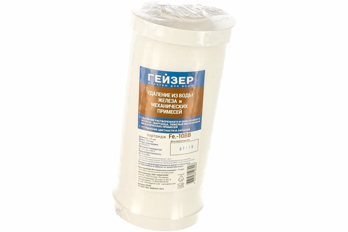 ГЕЙЗЕР Fe-10BB Картридж для обезжелезивания воды, ионообменное волокно и гранулированный уголь 28199