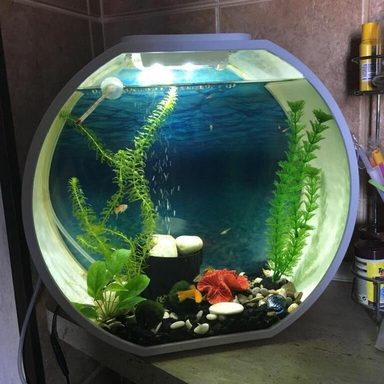 | Отзыв: | Вообще интересный и не обычный аквариум с разной подсветкой либо синей либо розовой на лампу одеваются пластиковые фильтра, в комплекте блок с двумя юсб ходами, помпа, с фильтром, которая прикрывается декором, и грунт . |