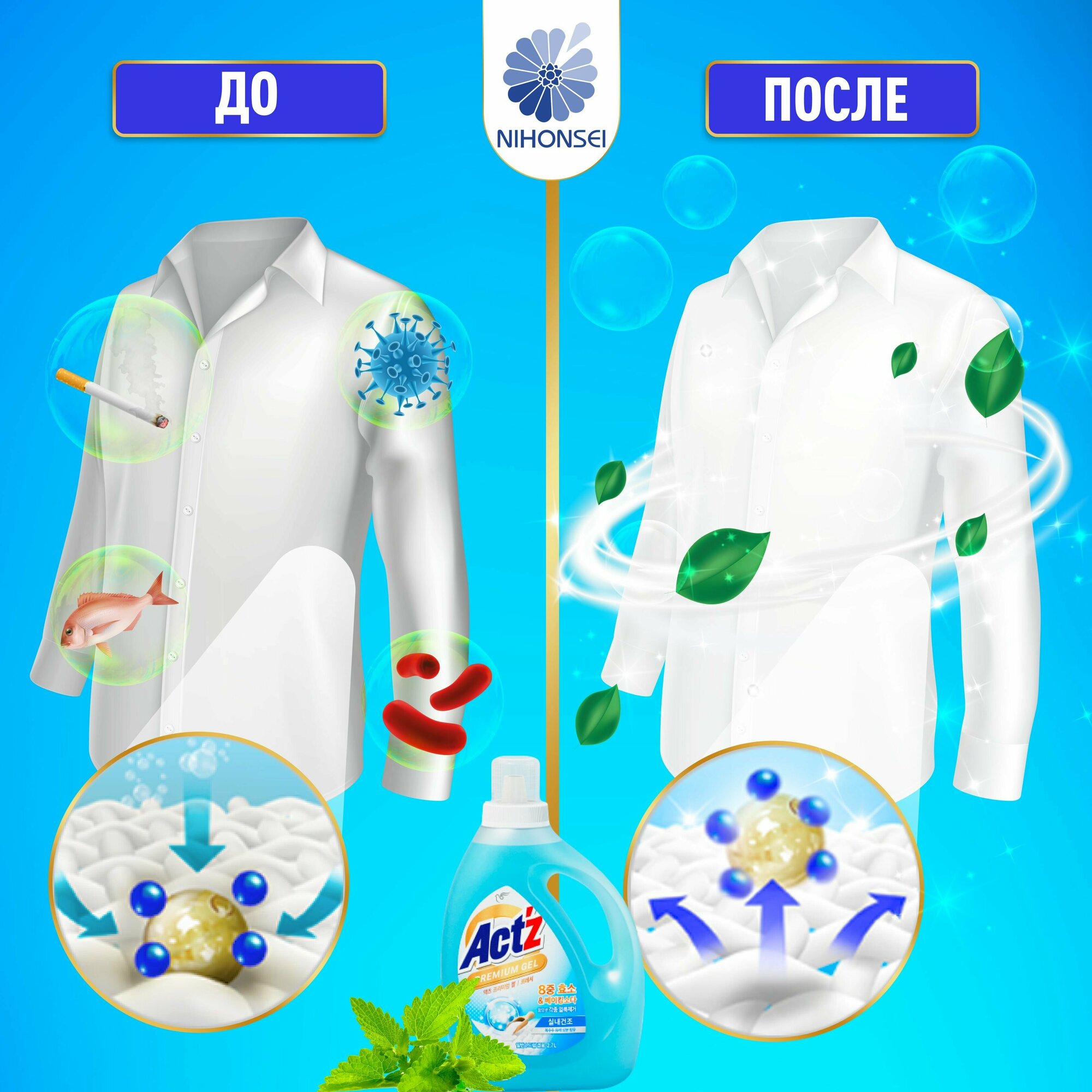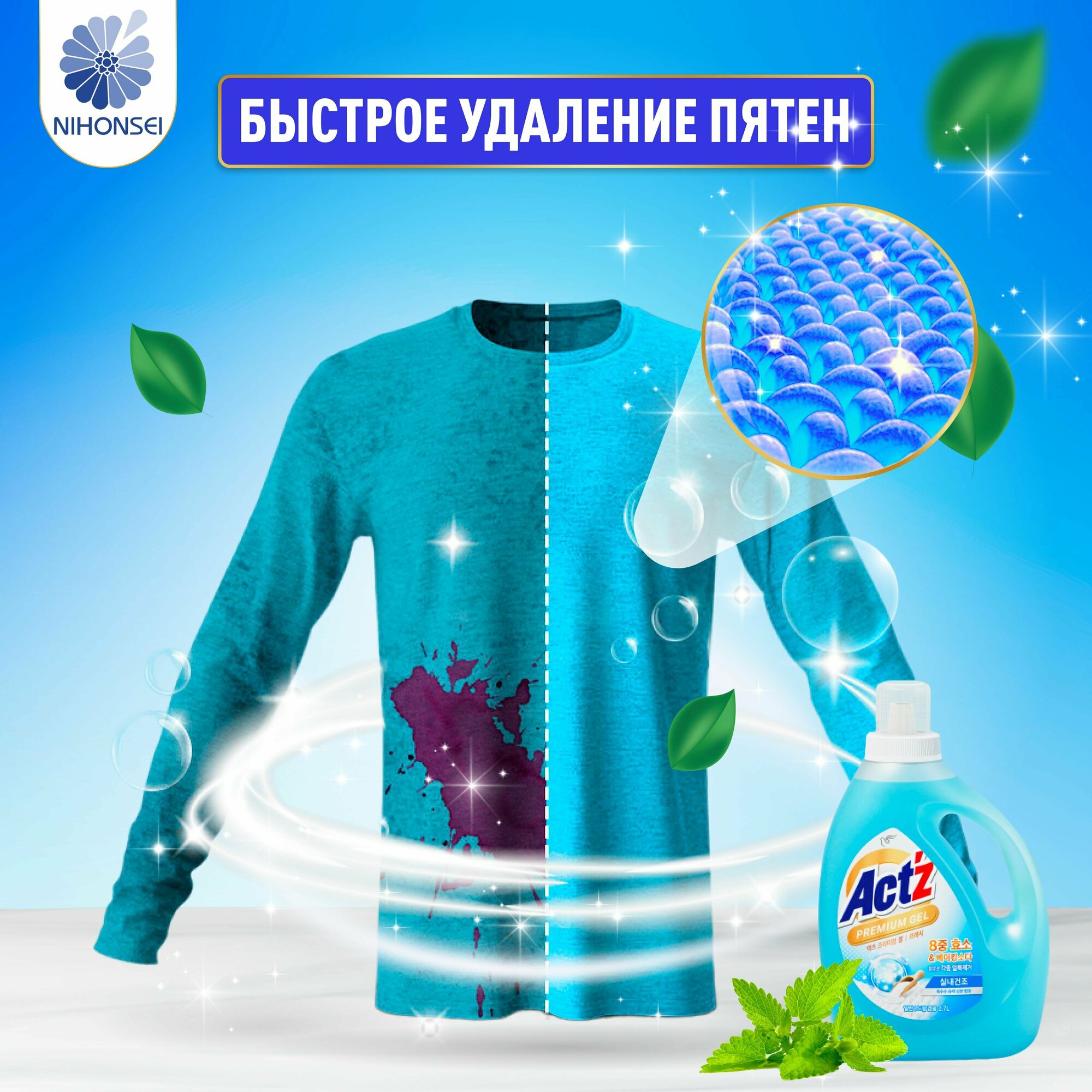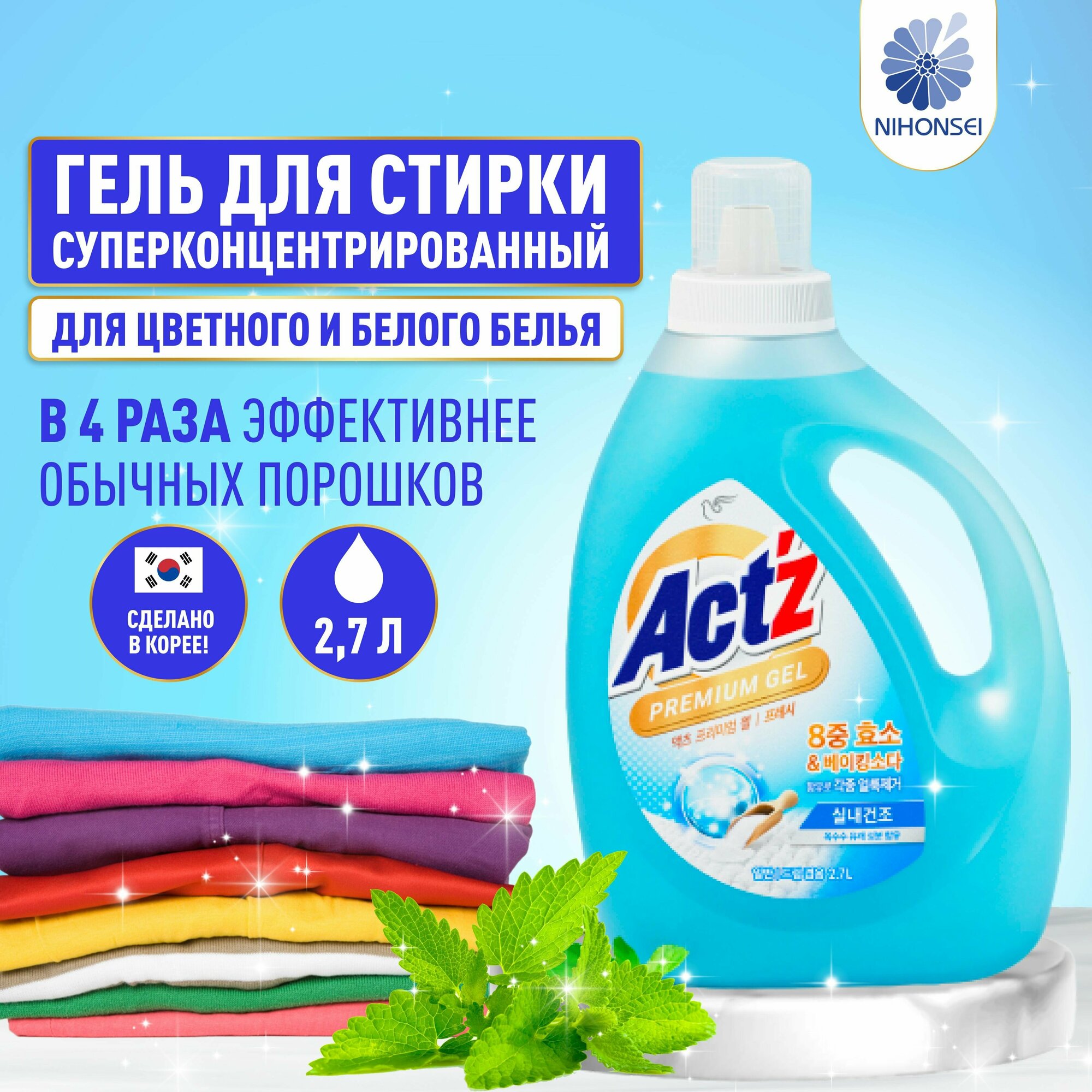 Концентрированный гель,Act’z Premium Gel,для стирки белья, аромат мяты 2,7 л 6477339