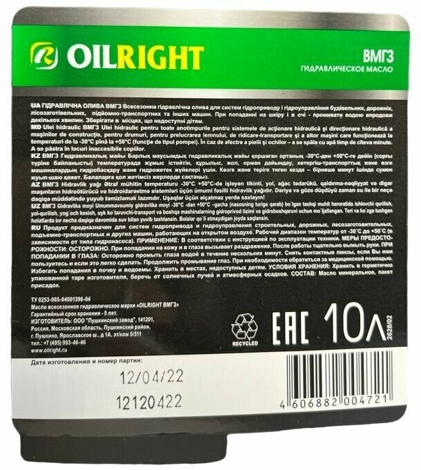 OILRIGHT ВМГЗ гидравлическое 10л (1/2)