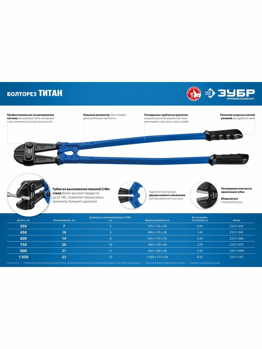 Ниже Вы можете прочитать отзывы на Болторез Зубр Титан Cr-Mo, 62 HRC Профессионал арт.23311-090_z02, ознакомится с подробными характеристиками, посмотреть интересные обзоры и фотографии на Болторез Зубр Титан Cr-Mo, 62 HRC Профессионал арт.23311-090_z02.