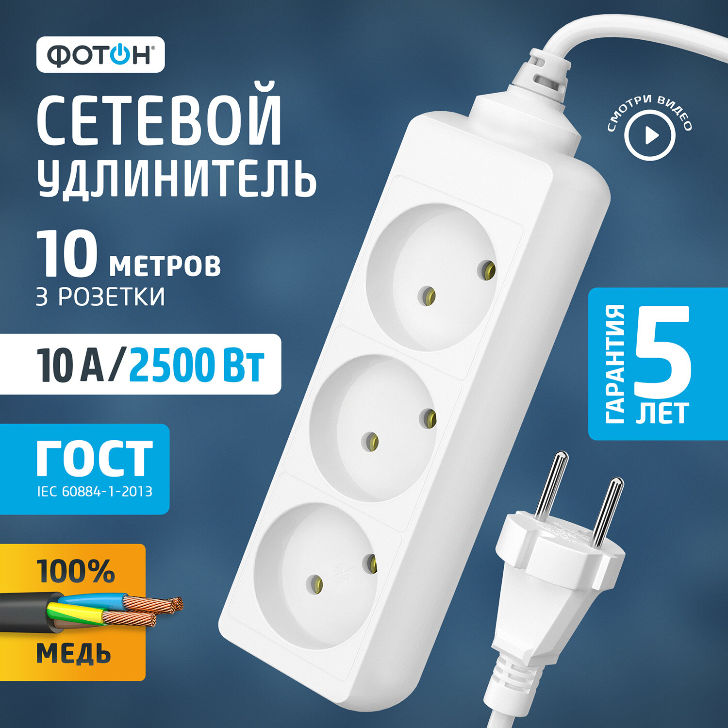 Удлинитель фотон 10-103, 3 розетки, б/з, 10А / 2500 Вт белый 10 м 0.75 м² 3