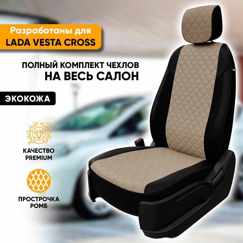 Комплект оригинальных чехлов на сиденья для LADA Vesta / Vesta SW Cross / Экокожа, Строчка: Ромб / Черный, Темно-бежевый / va-lv-vt-chetb-r