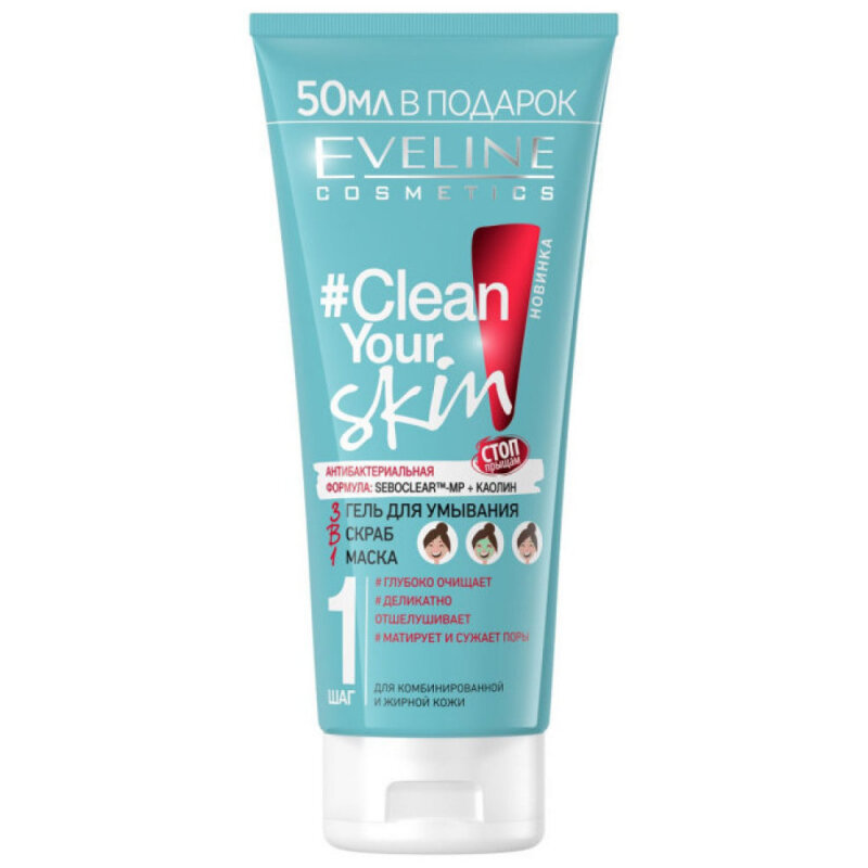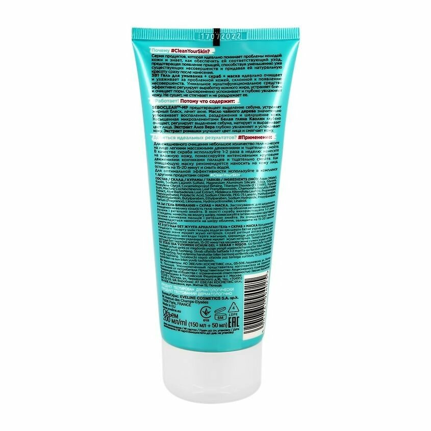 Гель для умывания-скраб-маска EVELINE Clean Your Skin 3в1, для комб.и жирной кожи, 200 мл