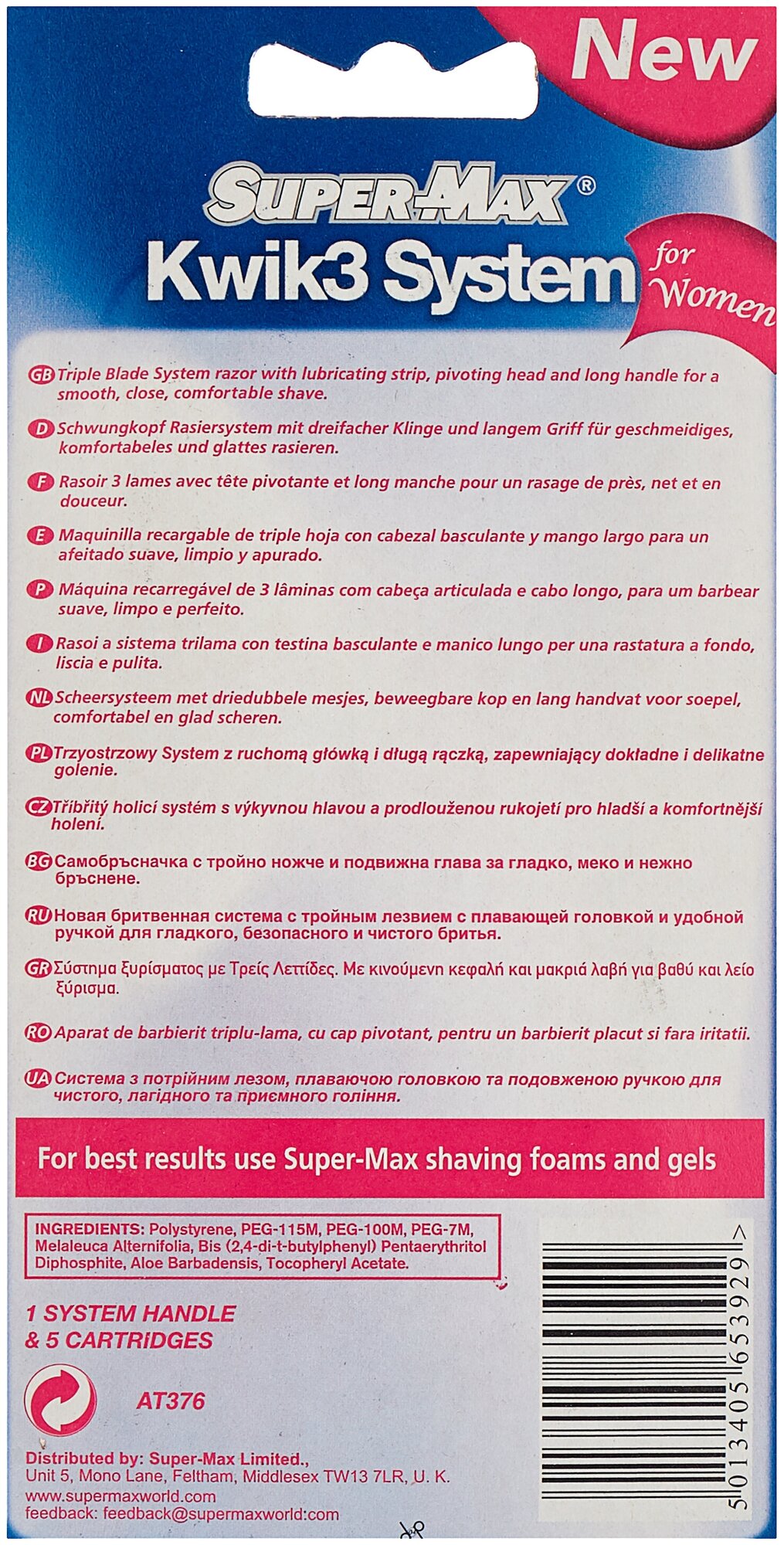 Женская бритва SUPER-MAX KWIK 3 System for Women, многоразовая, станок и 4 сменных картриджа с тройным лезвием