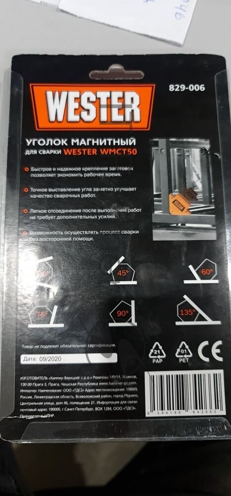 Магнитный уголок для сварки Wester WMCT50 829-006, углы 30, 45, 60, 75, 90, 135