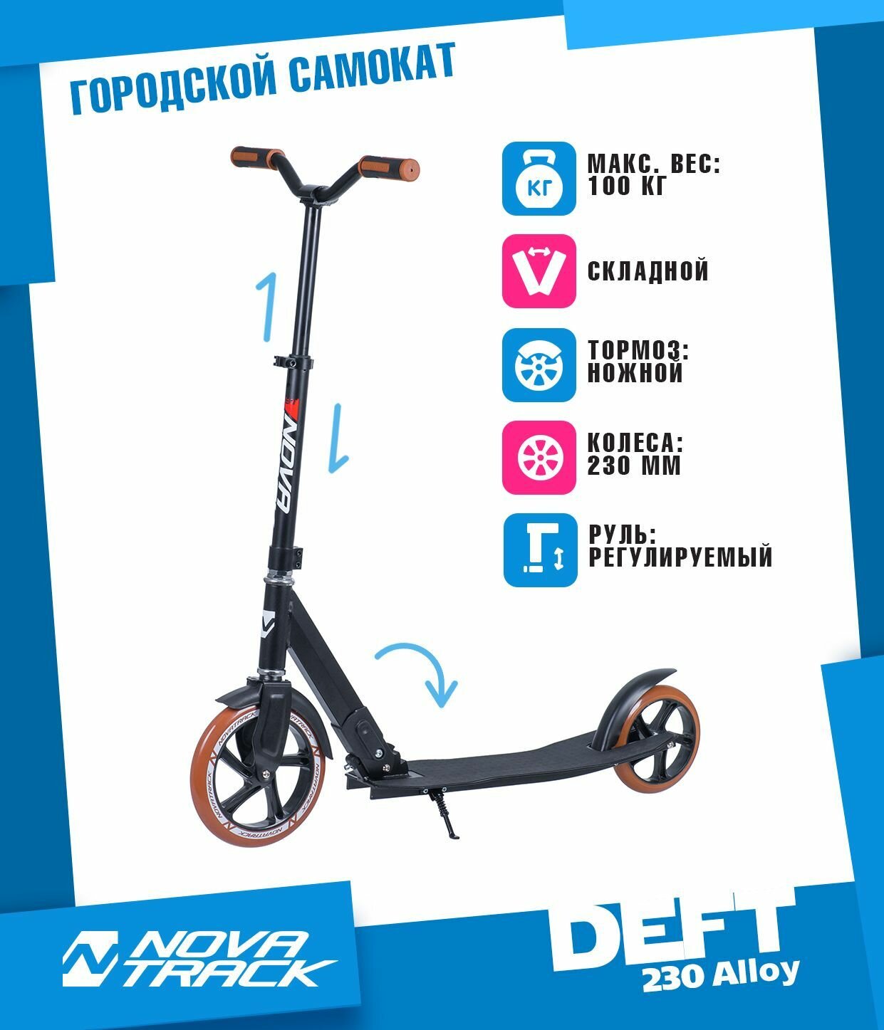 самокат 2-х колесный 230/180 мм городской подростковый deft алюминиевый складной 70 кг novatrack 230.deft.lm21