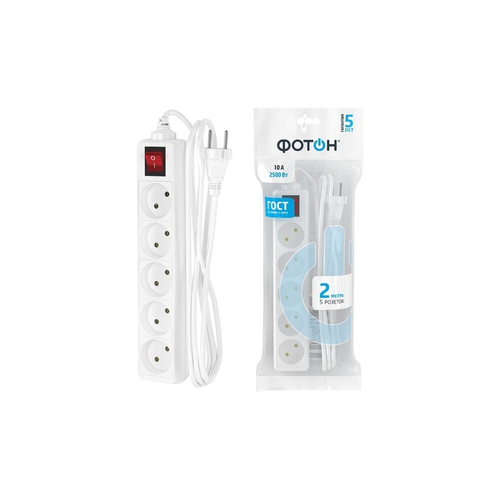 Удлинитель сетевой для розетки фотон 10А 2м 5 розеток с выключателем белый, ГОСТ