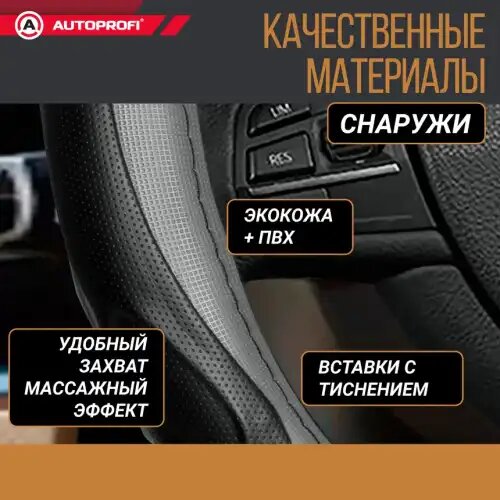 Купить Оплетка на руль AUTOPROFI M 38см гелевый наполнитель, спорт.дизайн, экокожа + ПВХ, черн/серая