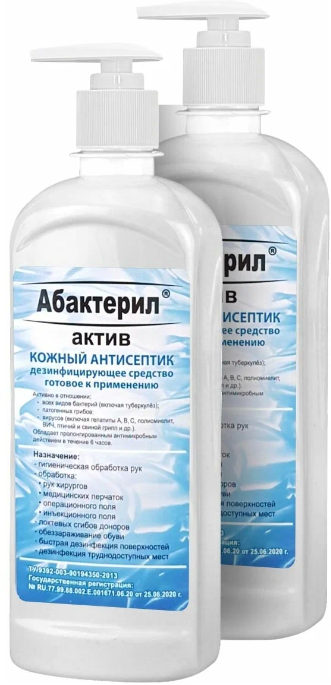 2 шт. Кожный антисептик с вирулицидной активностью ГОСТ 12.1.007-76 Абактерил-Актив с насос-дозатором 1 л.